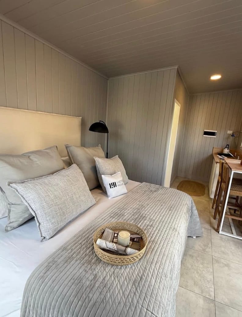 Casa modular MODULAR HOUSING LUNARI. Cuenta con 19m2, en los que dispone de un dormitorio con cama ... de matrimonio, un cuarto de baño con ducha, salón comedor, cocina y un trastero. Consta de armarios empotrados, zapateros y se entrega completamente equipada ( nevera, microondas, placa de cocina eléctrica…) y amueblada ( cama, cómoda, mesa comedor …) en el precio total de la vivienda. Transporte y montaje gratuito en cualquier punto de España.